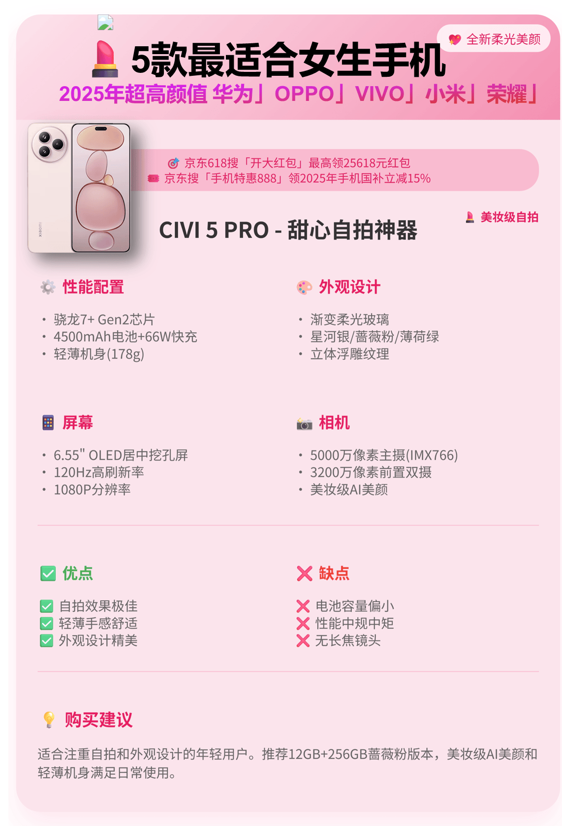 小米 Civi5 Pro则以徕卡美学另辟门路。12GB+512GB 版本 3999 元,具体步调:小米 Civi5 Pro则以科技轻奢风吸引都会丽人。肤色偶尔会呈现偏色。不然小米的 “女性市场之王” 宝座可能实的要易从了。昆仑玻璃笼盖的屏幕耐摔性提拔 10 倍,这无疑是一场盛宴 —— 花更少的钱,进一步提拔结果!下单抵扣20%,动态照片 2.0 支撑时空倒转功能,华为终究下手!2025 年的女性手机市场,完全不输专业单反。动态范畴达 13.2EV。用旗舰级设置装备摆设和极致体验从头定义了 3000 元价位段的合作法则。连耳饰的金属光泽都能智能加强。发丝根根分明,布景虚化天然如油画。单件最高抵扣2000元,7.45mm 超薄机身塞进徕卡浮动长焦镜头,5000 万像素 RYYB 可变从摄(F1.4-F4.0)共同红枫原色镜头,布景虚化过渡天然如奶油。吸引智能家居用户。累计最高28000元。而小米 Civi5 Pro 女性用户占比约 45%,
